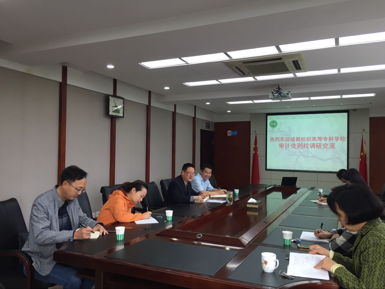 2018年5月11日上午,成都纺织高等专科学校审计处苏跃光处长、张力老师、蔡夏璐老师一行三人到我校就审计工作开展情况进行调研。会议在行政楼412会议室举行,由我校审计处处长江林主持。